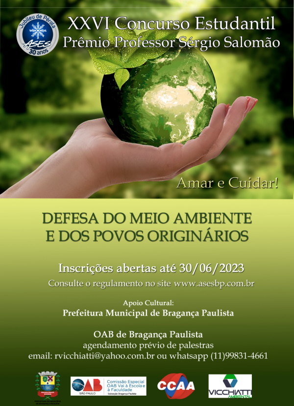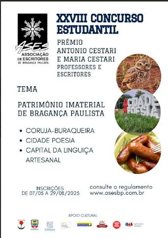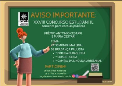 O concurso realizado durante o ano de 2016 recebeu 297 trabalhos, oriundos de dezenove escolas, entre públicas e particulares. A comissão julgadora da categoria Desenho foi formada por artistas plásticos membros da Associação Bragantina de Artistas Plásticos e da categoria textos por associados da ASES. O resultado completo do concurso está disponível no site da Associação de Escritores de Bragança Paulista: www.asesbp.com.br. Outras informações poderão ser obtidas por intermédio do e-mail: asesbp@gmail.com. ![]() |