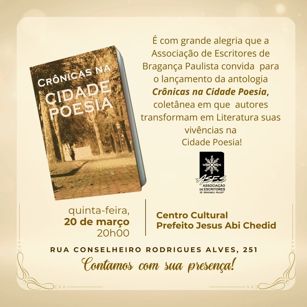 Prêmio Literário Cidade Poesia a realizar-se no dia 26 de maio, às 20h30, no salão de festas do NC Apart Hotel – localizado à avenida Carlos de Campos, 366 – Jardim São José – Bragança Paulista – SP.